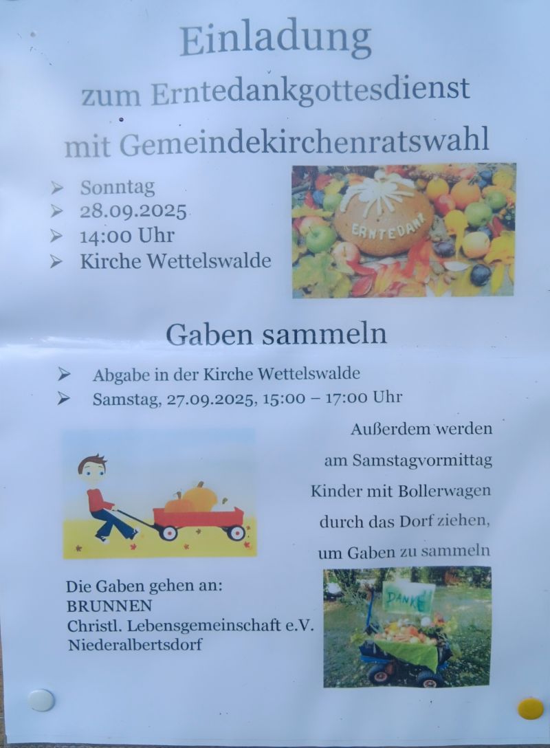23.09.2025 | ![]() Möglichkeiten zum Erntefest zu spenden (allerdings nur info von Wettelswalde warum nicht Thonhausen ?) |