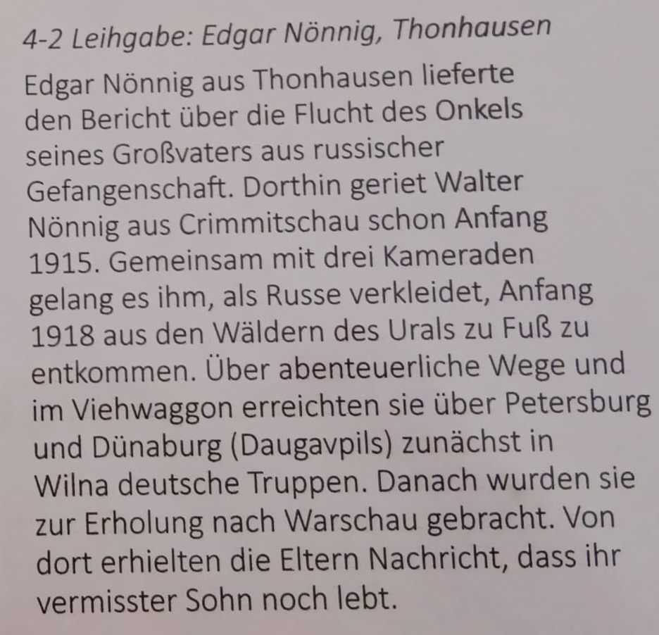 von Hans Faladas Bruder Ulrich Ditzen. Gleichzeitig wurde von den Kuratoren der Burg Posterstein Bürger aus der hiesigen Region gebeten,soweit vorhanden, eigene Feldpostkarten, Briefe oder Zeugnisse aus jener Kriegszeit 1914-1918, als begleitendes lokalhistorisches Material mit zur Verfügung zu stellen. Hier eine Leihgabe zum Teilthema der Ausstelung (Nr. 4) Kriegsgefangenschaft. Gleichzeitig hat Klaus Köhler Wettelswalde vom Heimatverein ebenfalls schriftliche mehrere Zeugnisse in die Ausstellung mit eingebracht. |
